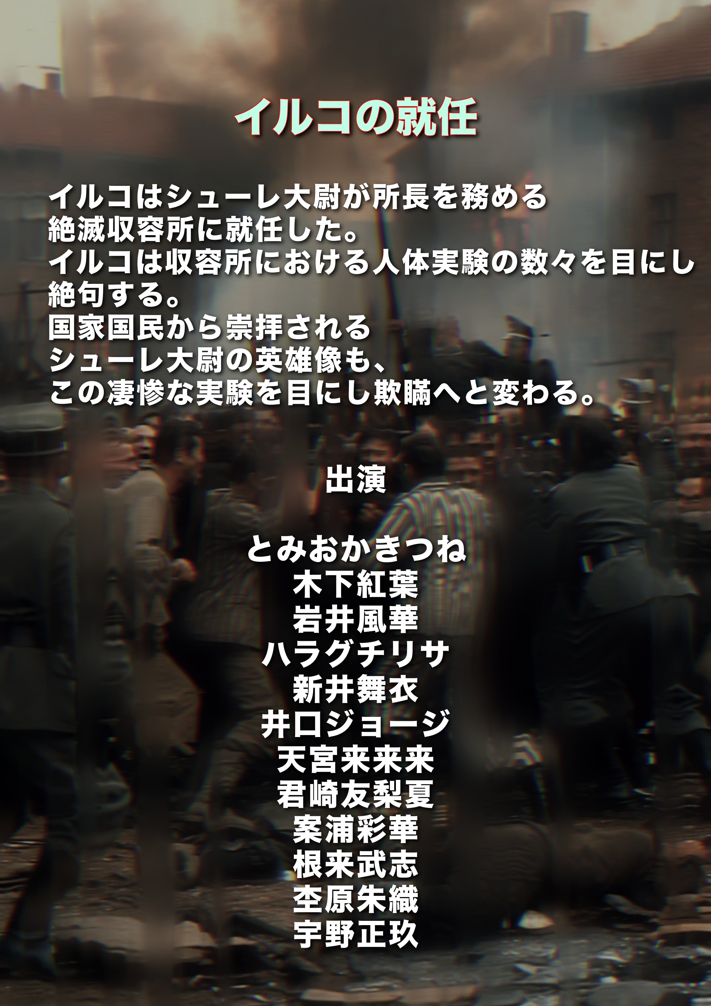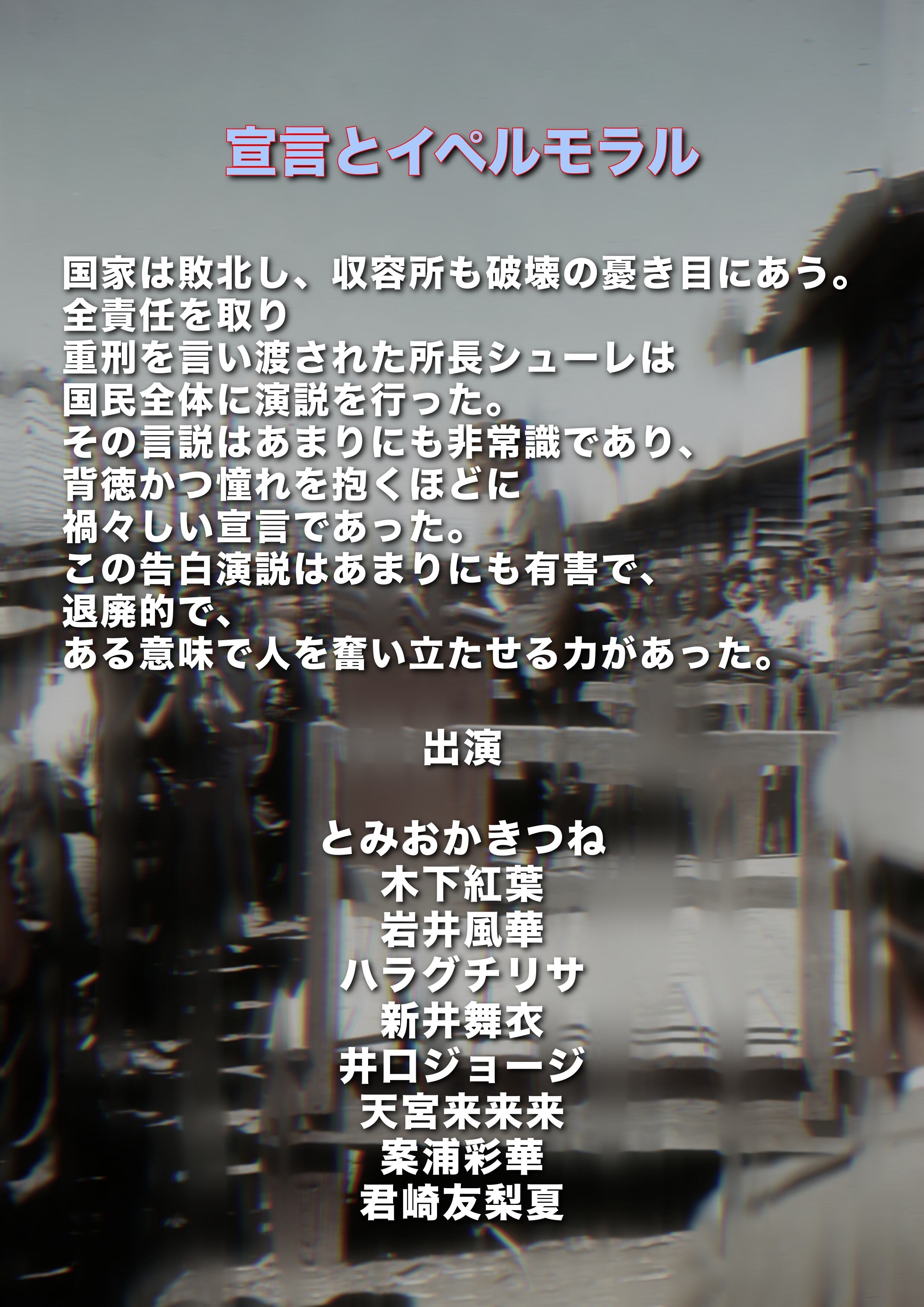 石田輝 植松俊(農耕楽団) 宇田川佳寿記(演劇制作体V-NET/ラビット番長) 大森さつき(アミティープロモーション) 加々見千懐 柏木亜美 奏那多 木下紅葉 清藤ひとみ 今野 未来(A-LIGHT) 酒井菜々夏 鈴木大二郎(A-LIGHT) 高橋弘幸((有)宝井プロジェクト) 武田法子 塚田詩織(クルーズグループ) 永山盛平(タイガー) 根来武志 花美えりぃ ひょい 宏洋(宏洋企画室(株)) 宮崎祐司 宮守伶奈 邑上笙太朗 安井茉穂 矢吹穂乃香(MME Works) 山本リョウ(芸能事務所popcorn)