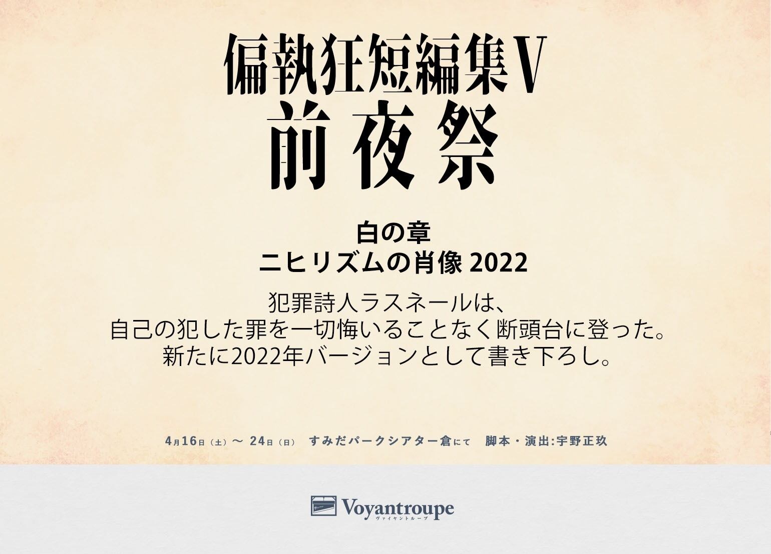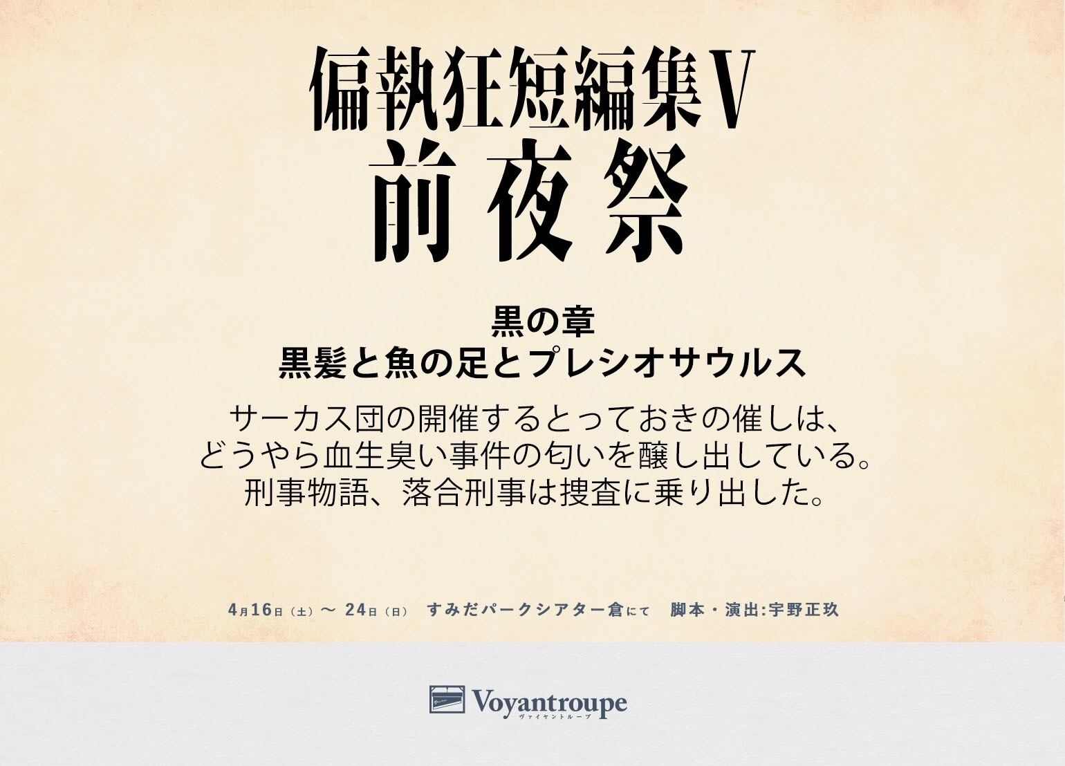 過去公演「偏執狂短編集Ⅰ~Ⅲ」の中から特に好評を博した作品から厳選した6作のリバイバル短編集。