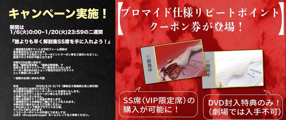 ※解剖集SS席チケットの予約フォーム開設は宣言集初日2/5となります。初日の受付で2枚のリピーターポイントクーポン券をご提示いただくと、最速でのご予約が可能となります